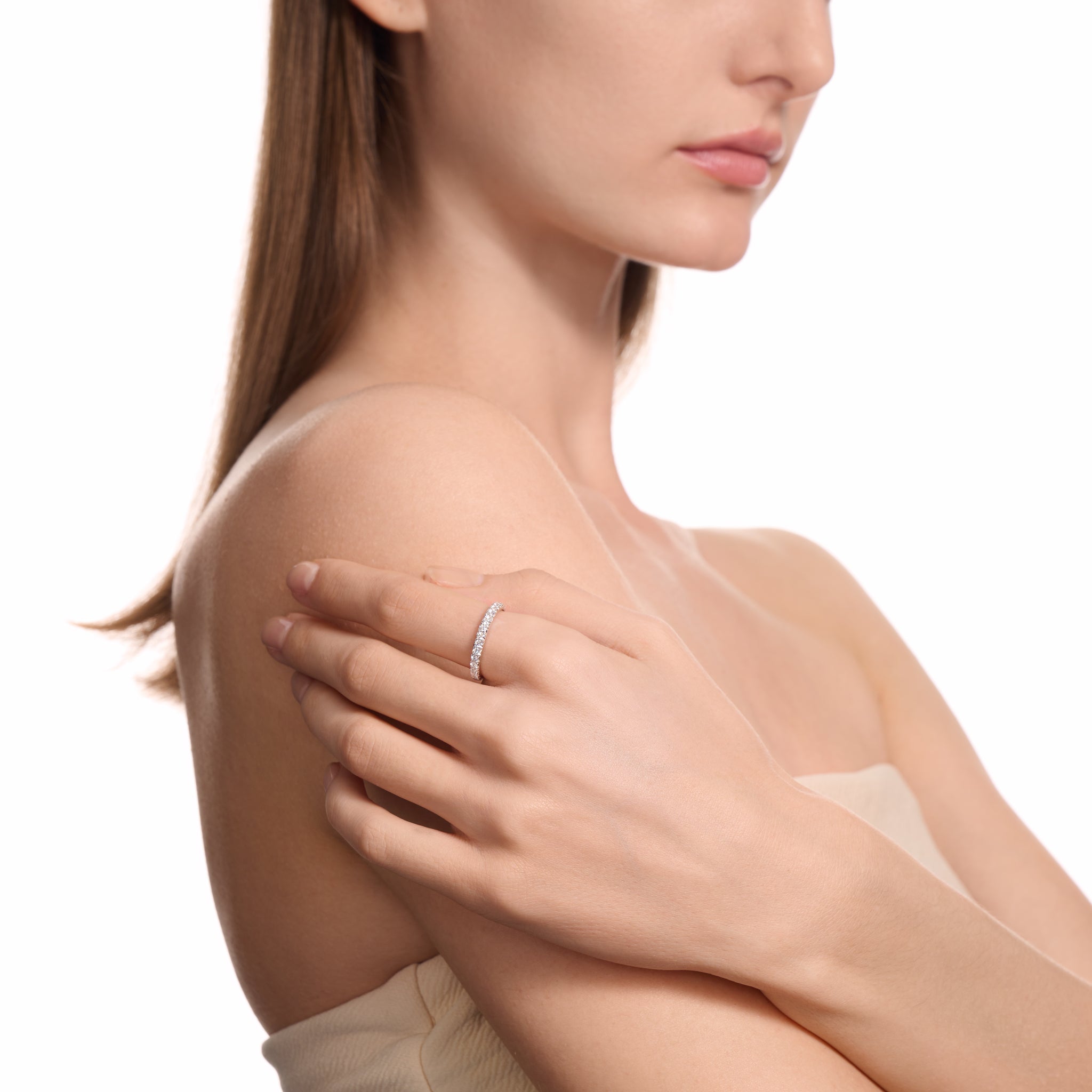 The Vela French Cut Pavé Band is designed for maximum sparkle and comfort. This clean and feminine style is the perfect stacking piece or can be worn alone for a touch of brilliance.