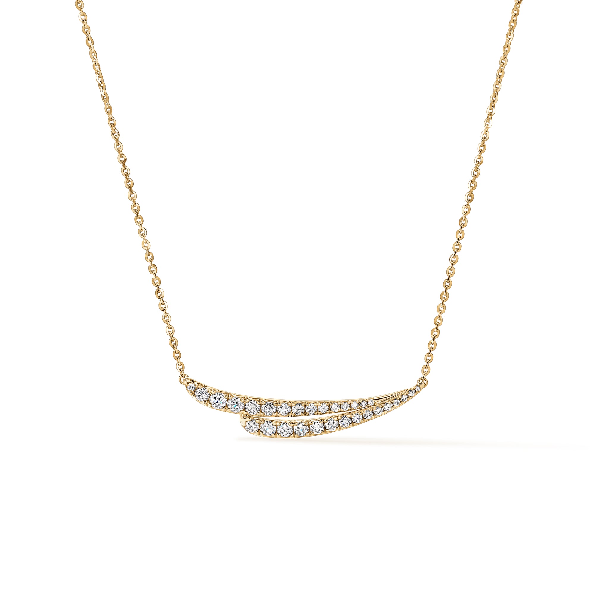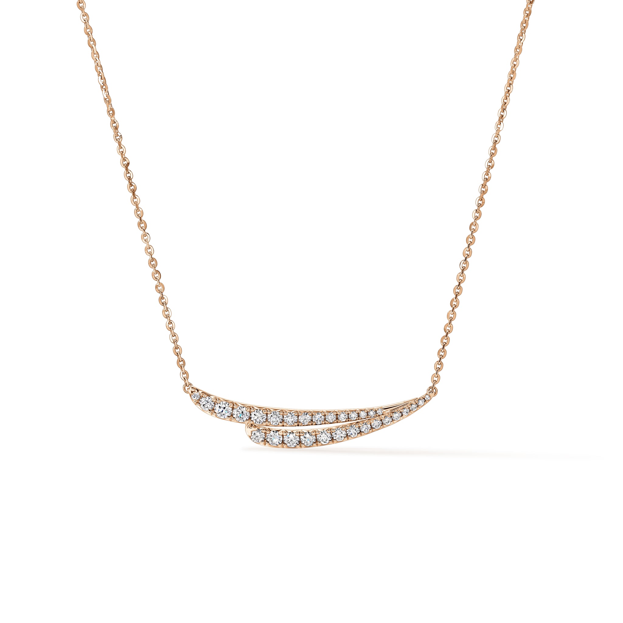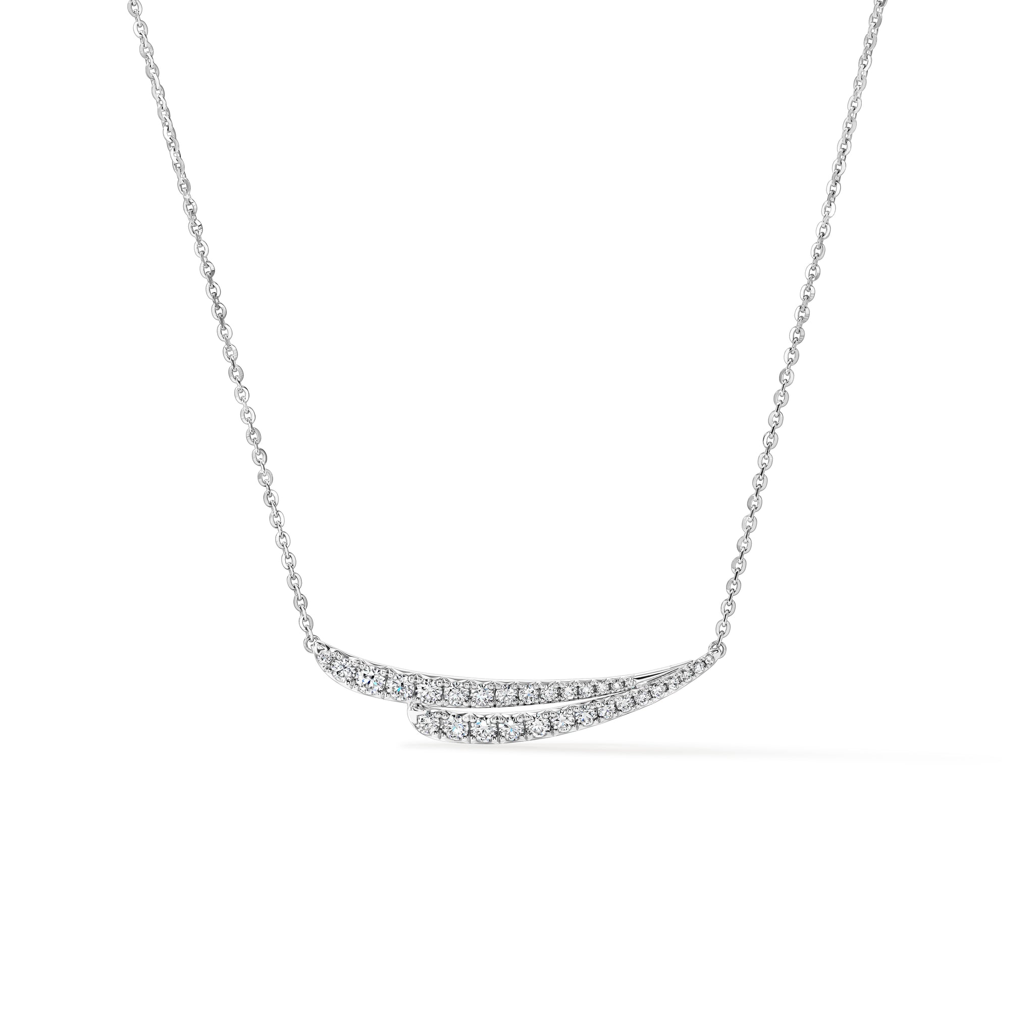 VELA French Cut Pavé Diamond Pendant Necklace immediately catches the eye with its elegant design. It features two overlapping diamond lines that mimic the graceful curves of the neck.
