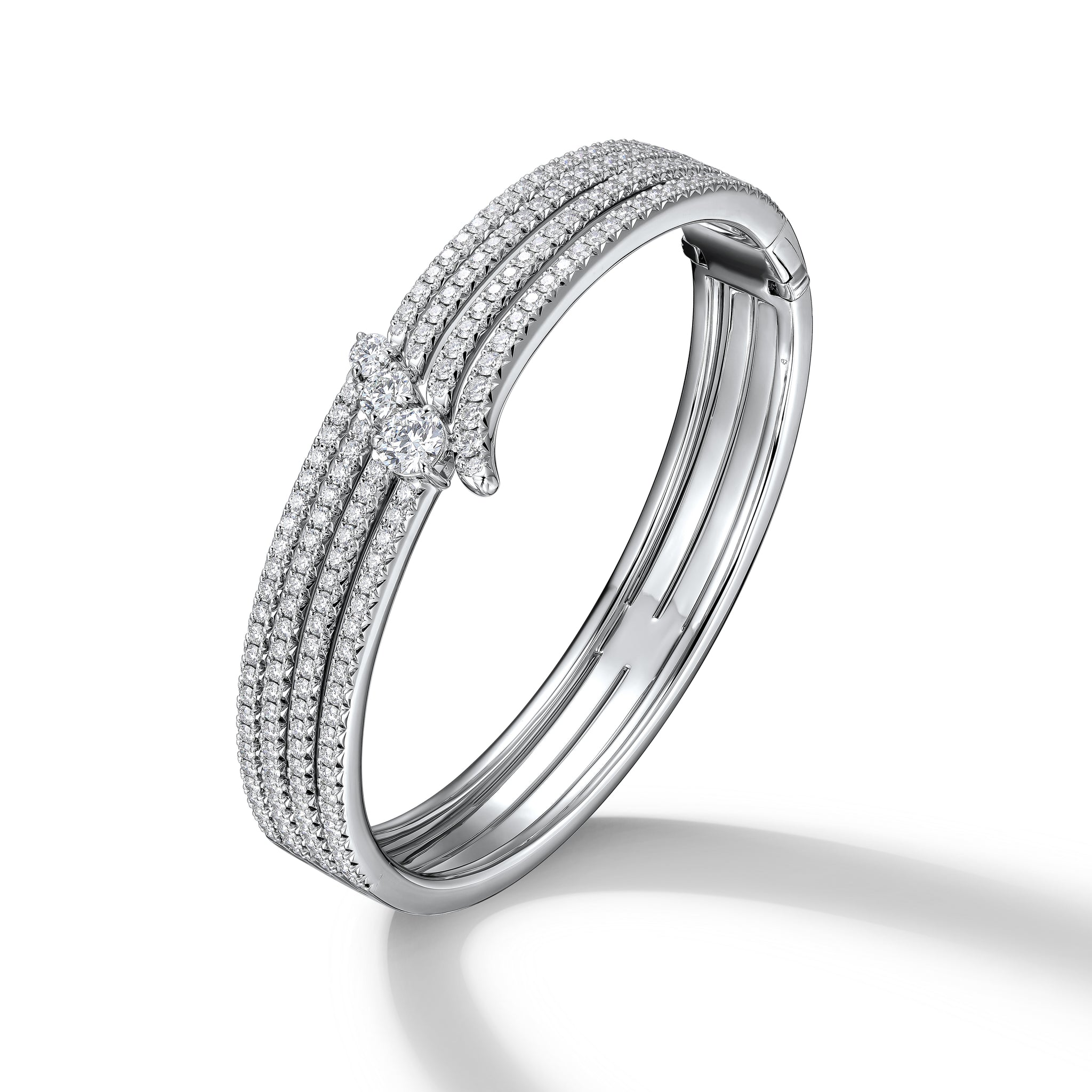 You can never have too much sparkle. The Vela French Cut Pavé Diamond Bangle features multiple rows of diamonds accented with brilliant solitaires to create a glamorous evening piece.