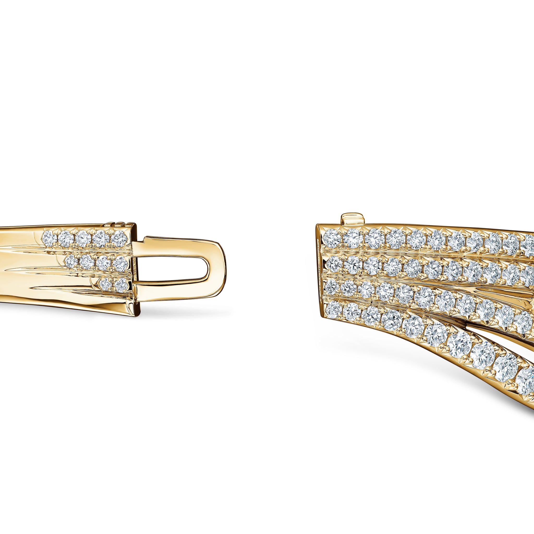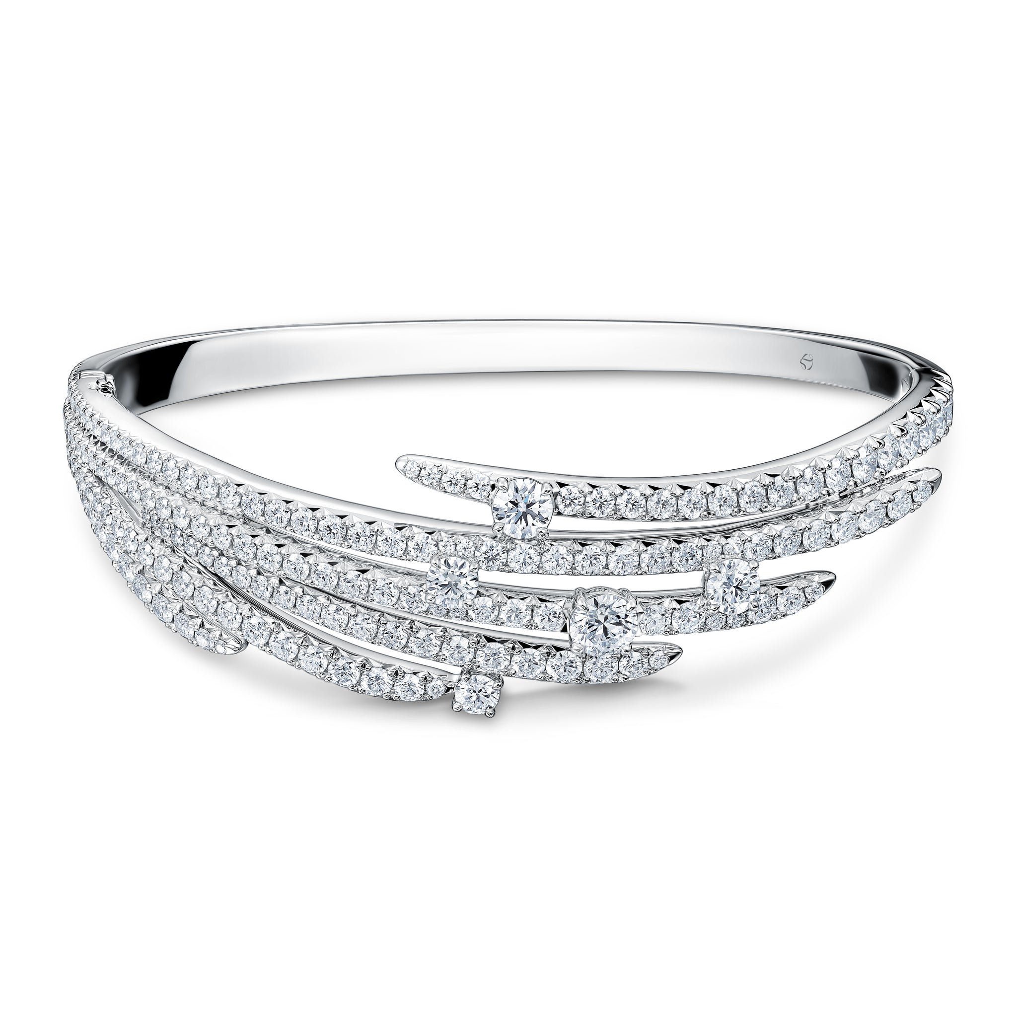 The Vela French Cut Pavé Bangle makes a striking statement. Multiple rows of pavé set diamonds curve around the wrist and are accentuated with brilliant solitaires to create plenty of glamor.