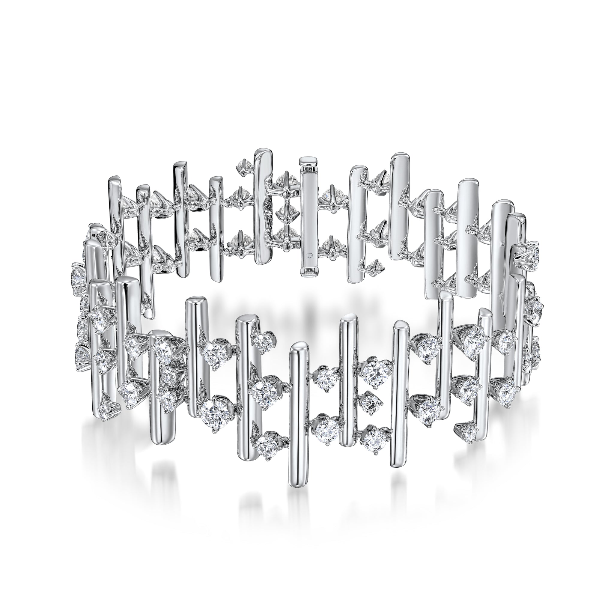 The Barre Multi-Row Small Bracelet is all about reading between the lines. This statement piece features sleek gold lines interspersed with floating diamonds in various sizes.
