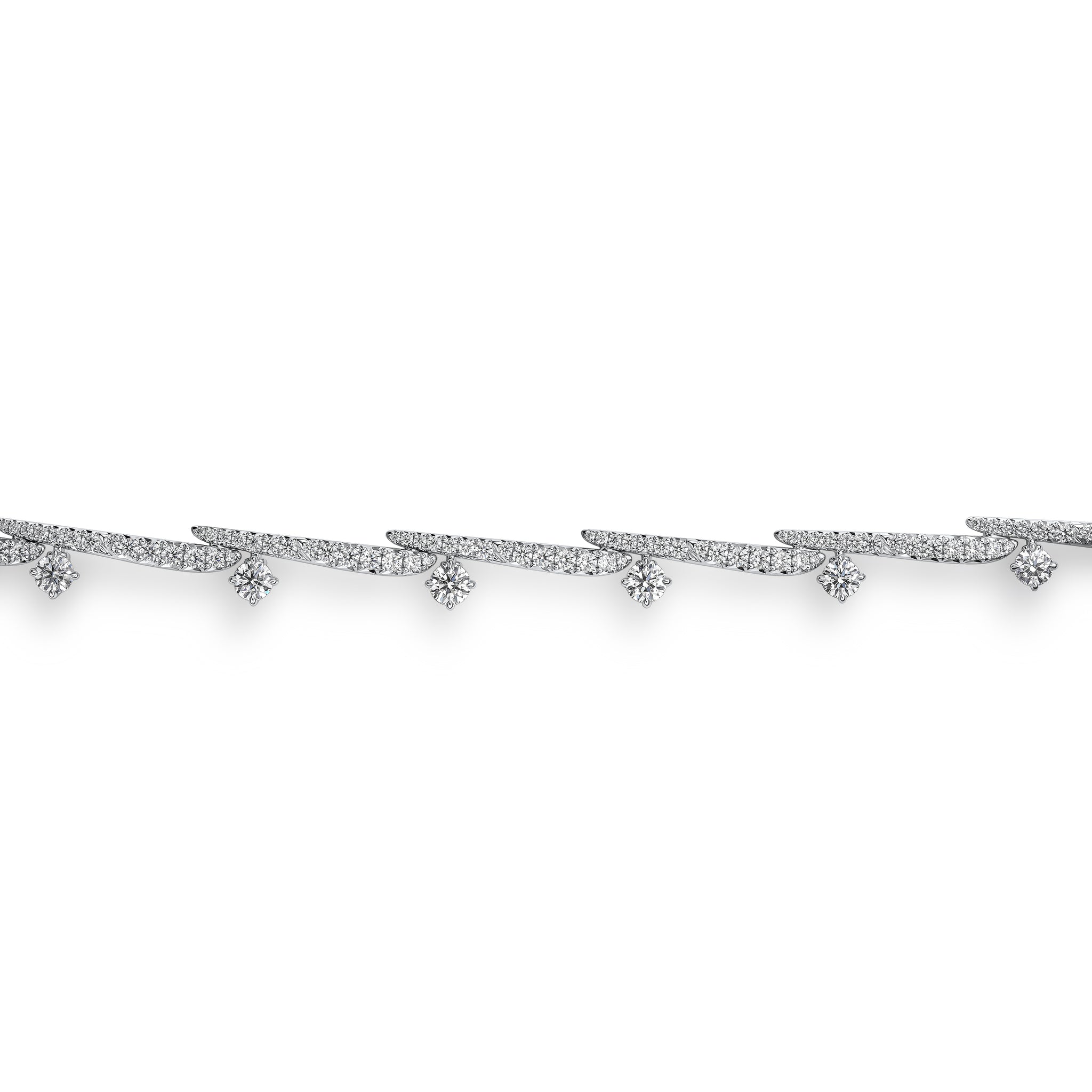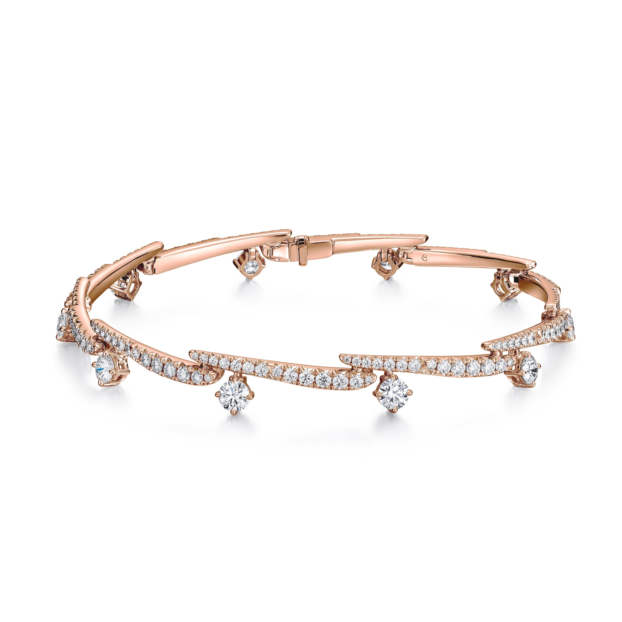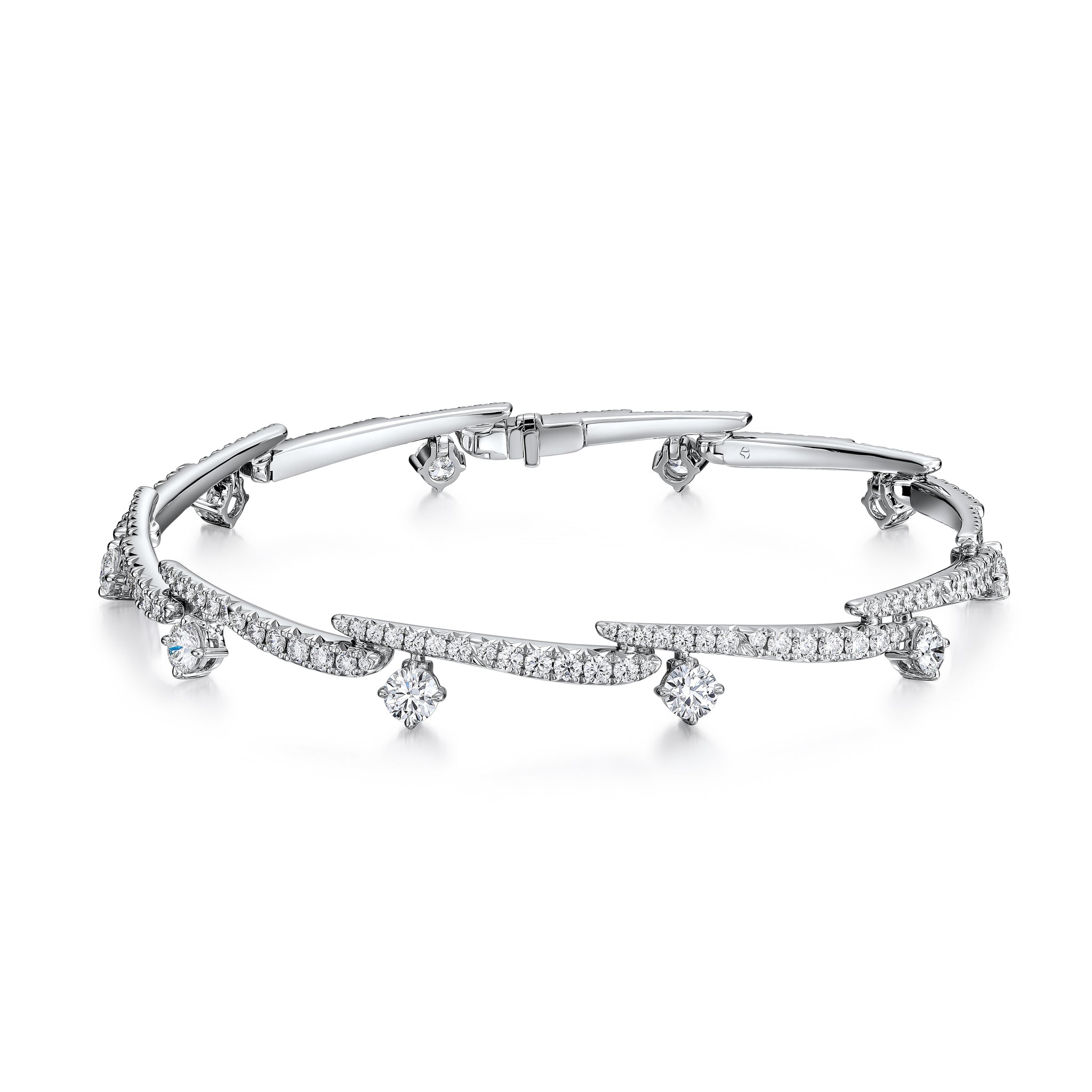 The power is in the details of the Vela Crossover Pavé Diamond Bracelet. This fully-paved style decorates the wrist with diamond “strokes” highlighted by brilliant solitaires.