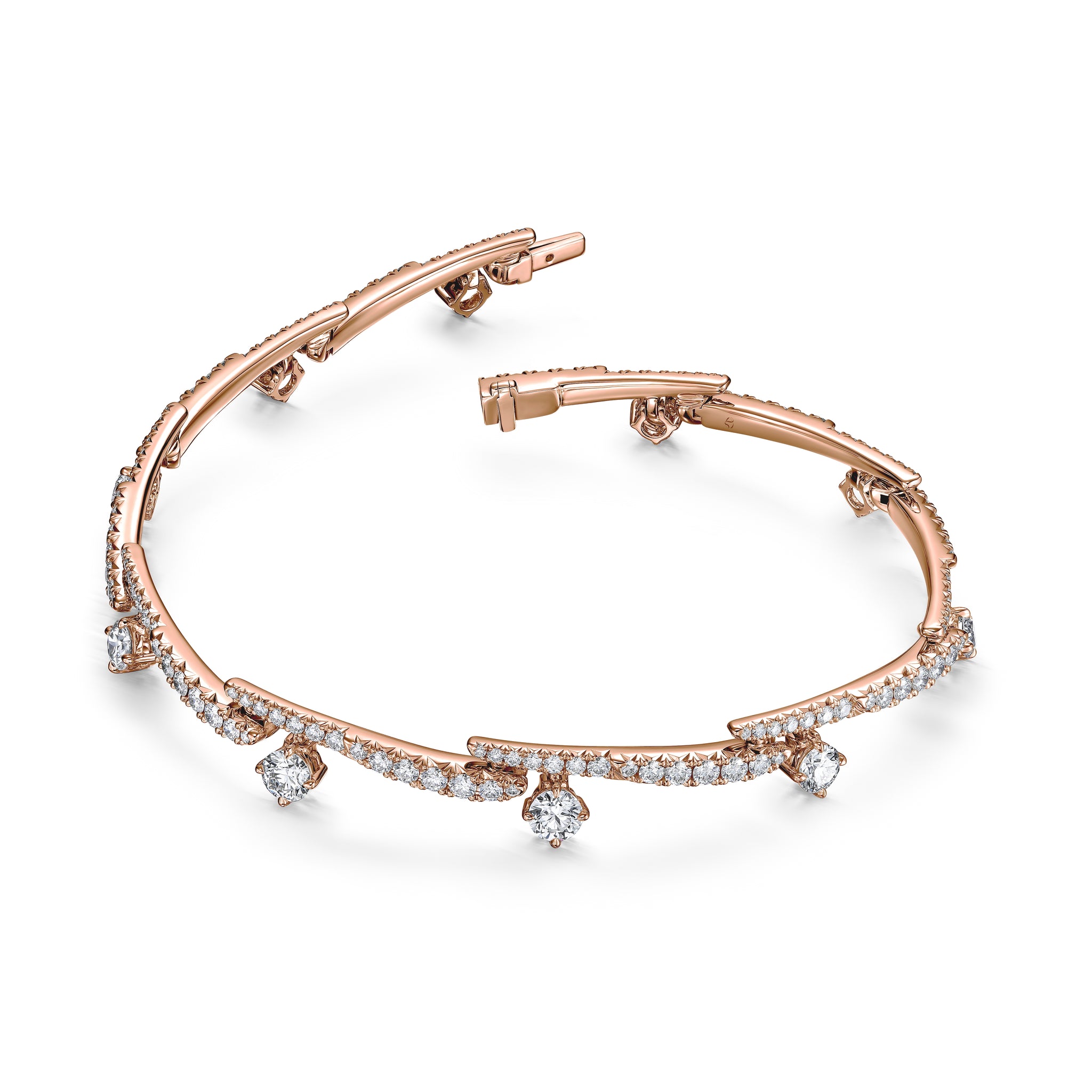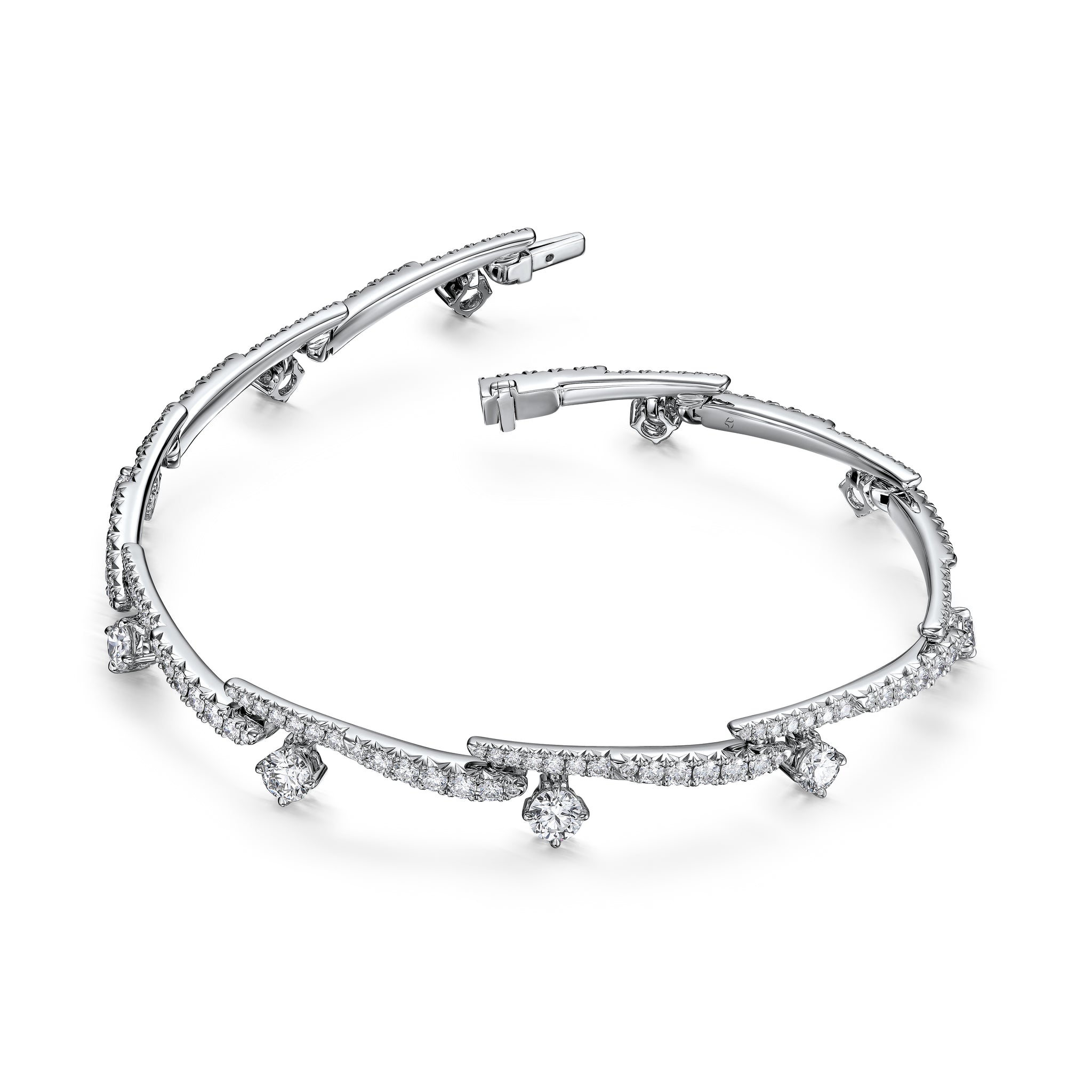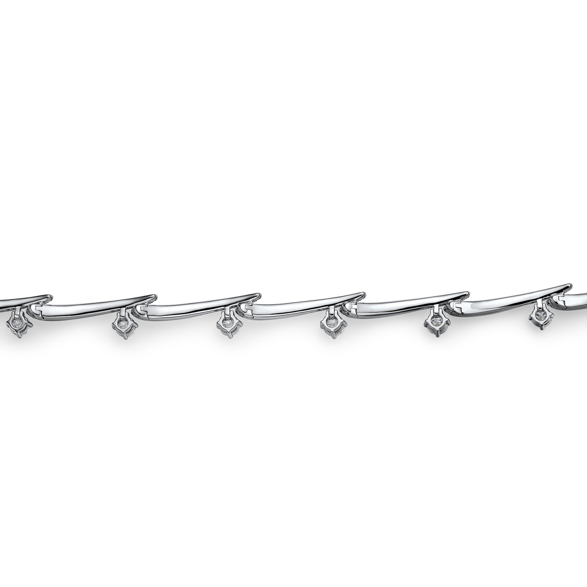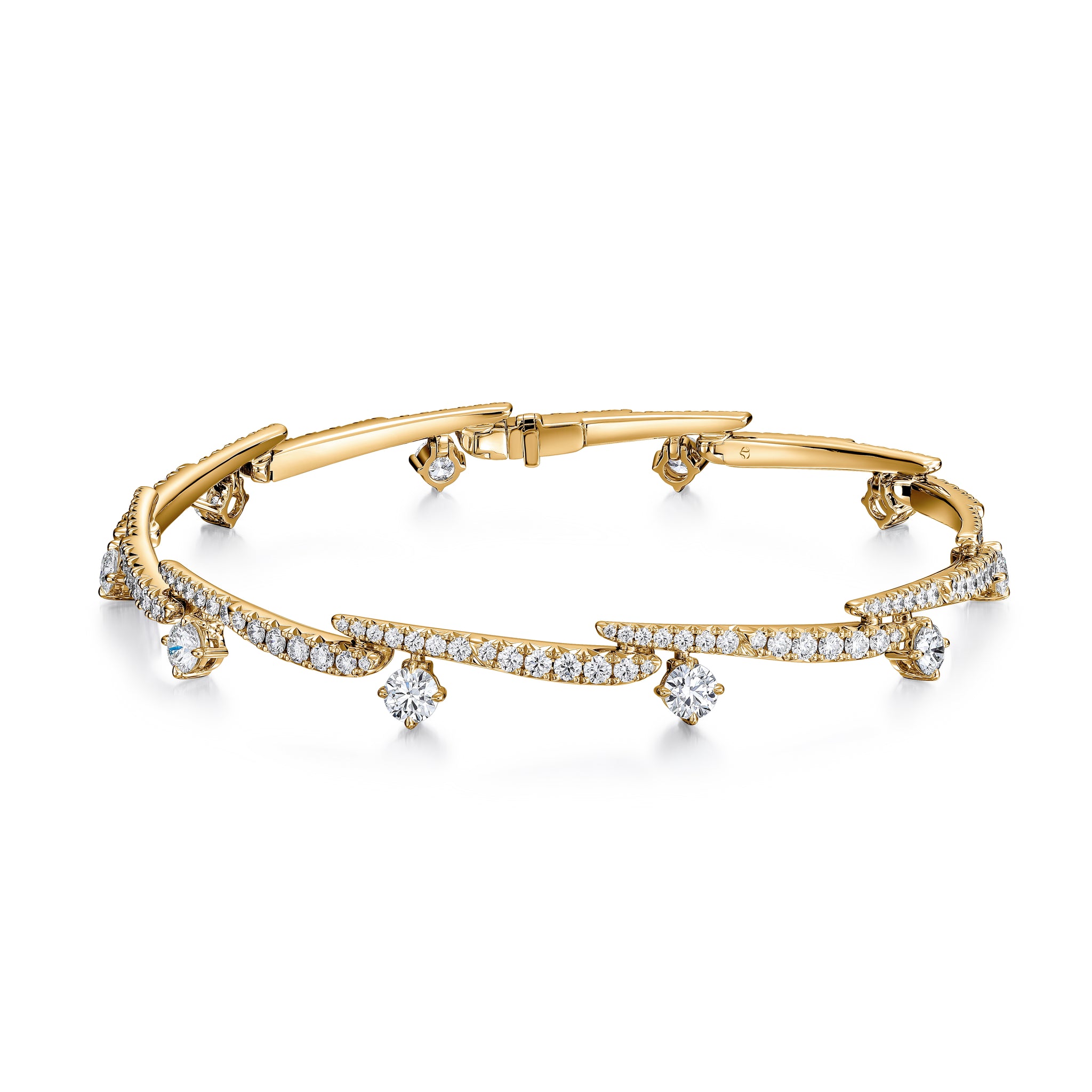 The power is in the details of the Vela Crossover Pavé Diamond Bracelet. This fully-paved style decorates the wrist with diamond “strokes” highlighted by brilliant solitaires.