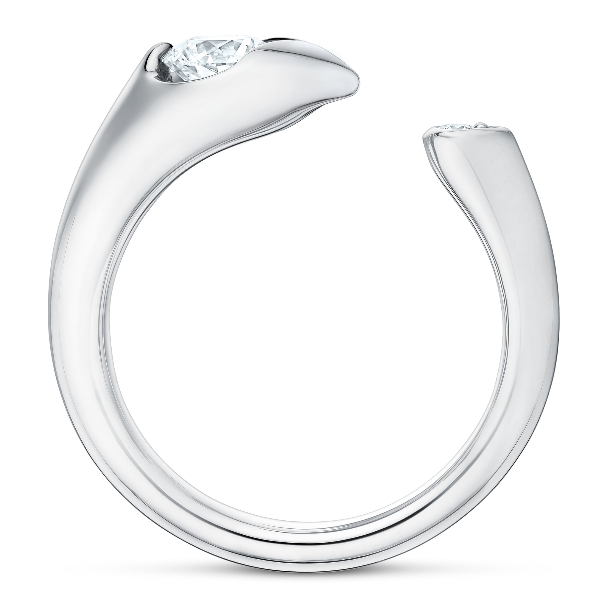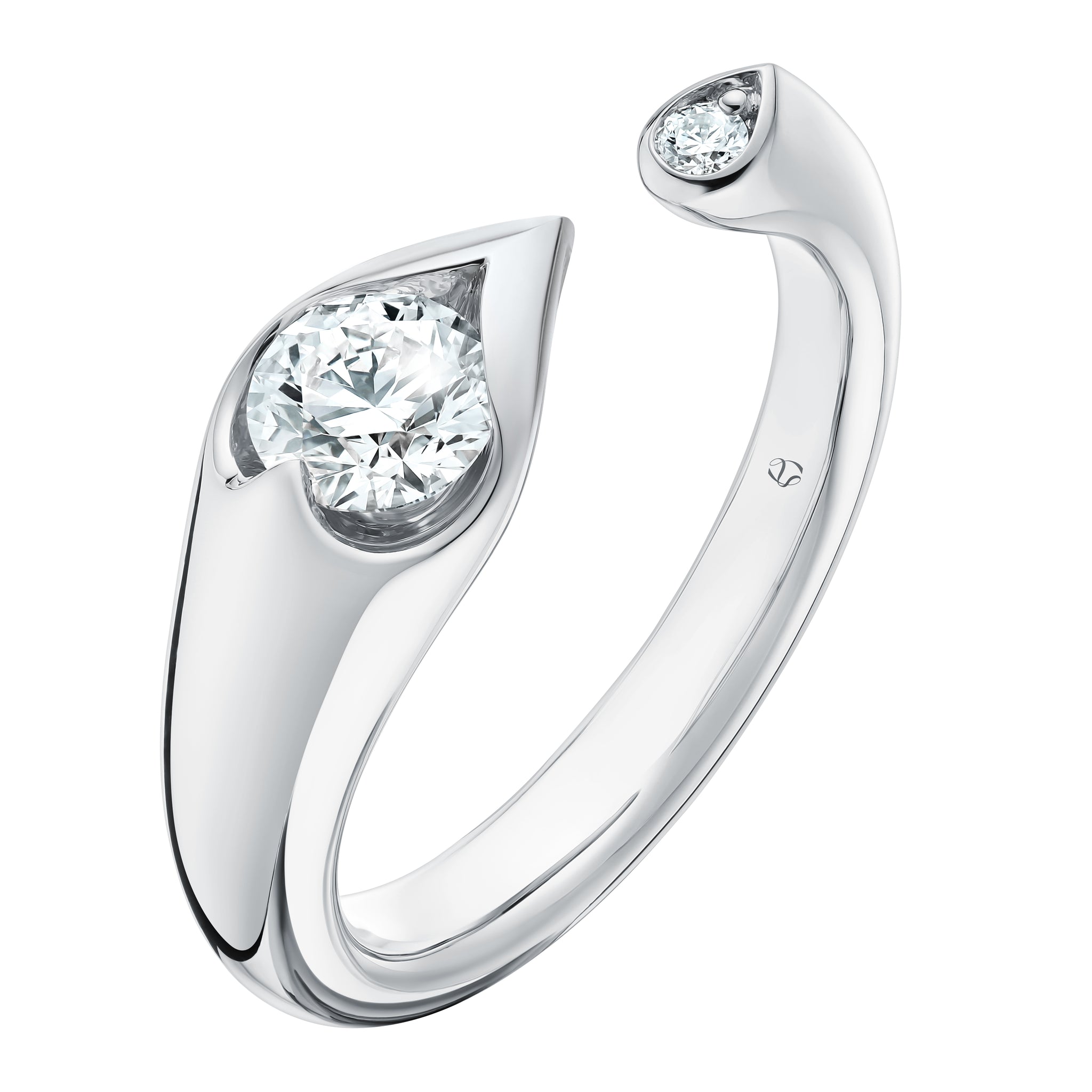 Complete your circle with the LU Droplet Open Ring. This organic silhouette envelops your finger in rich 18K gold. It’s finished with two diamond drops on each end —one large, one small.