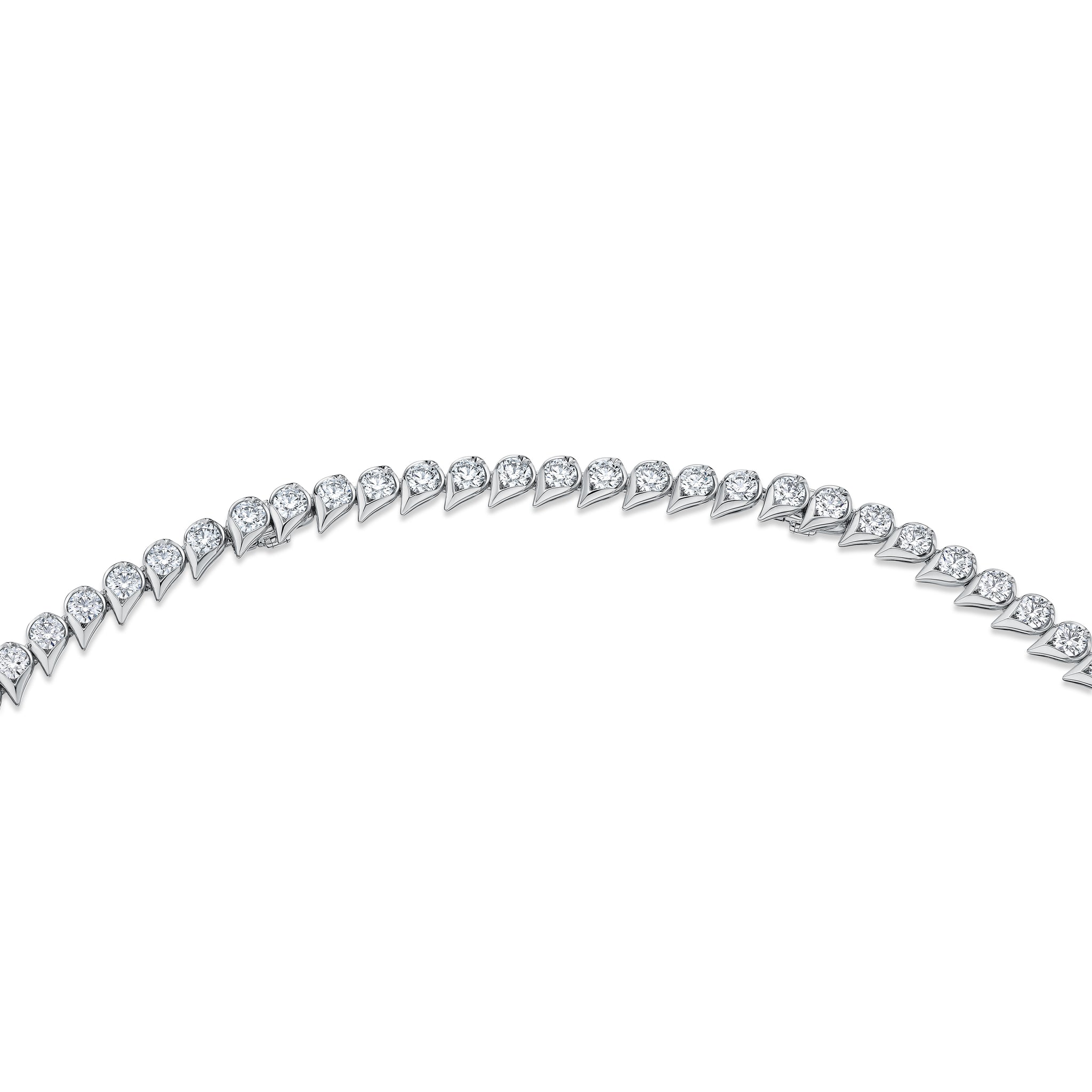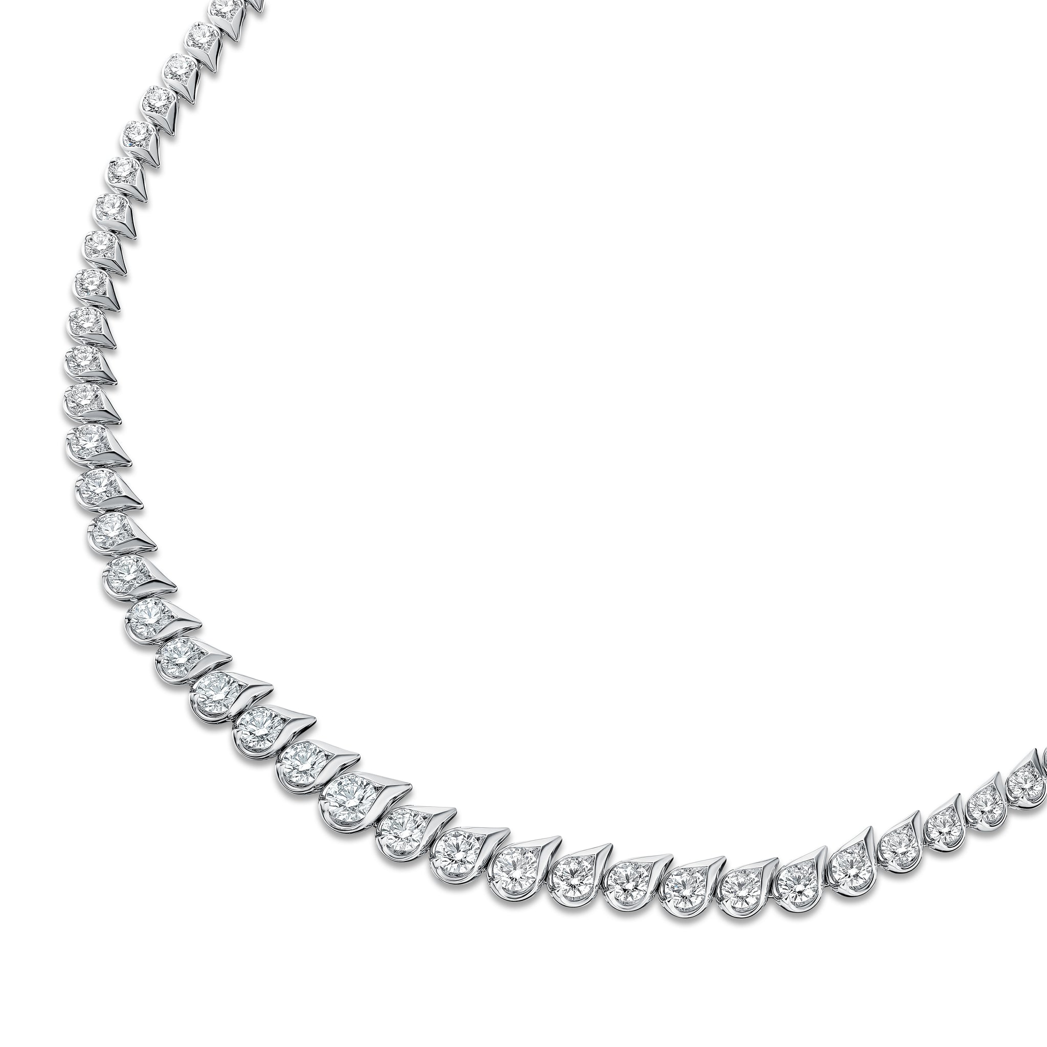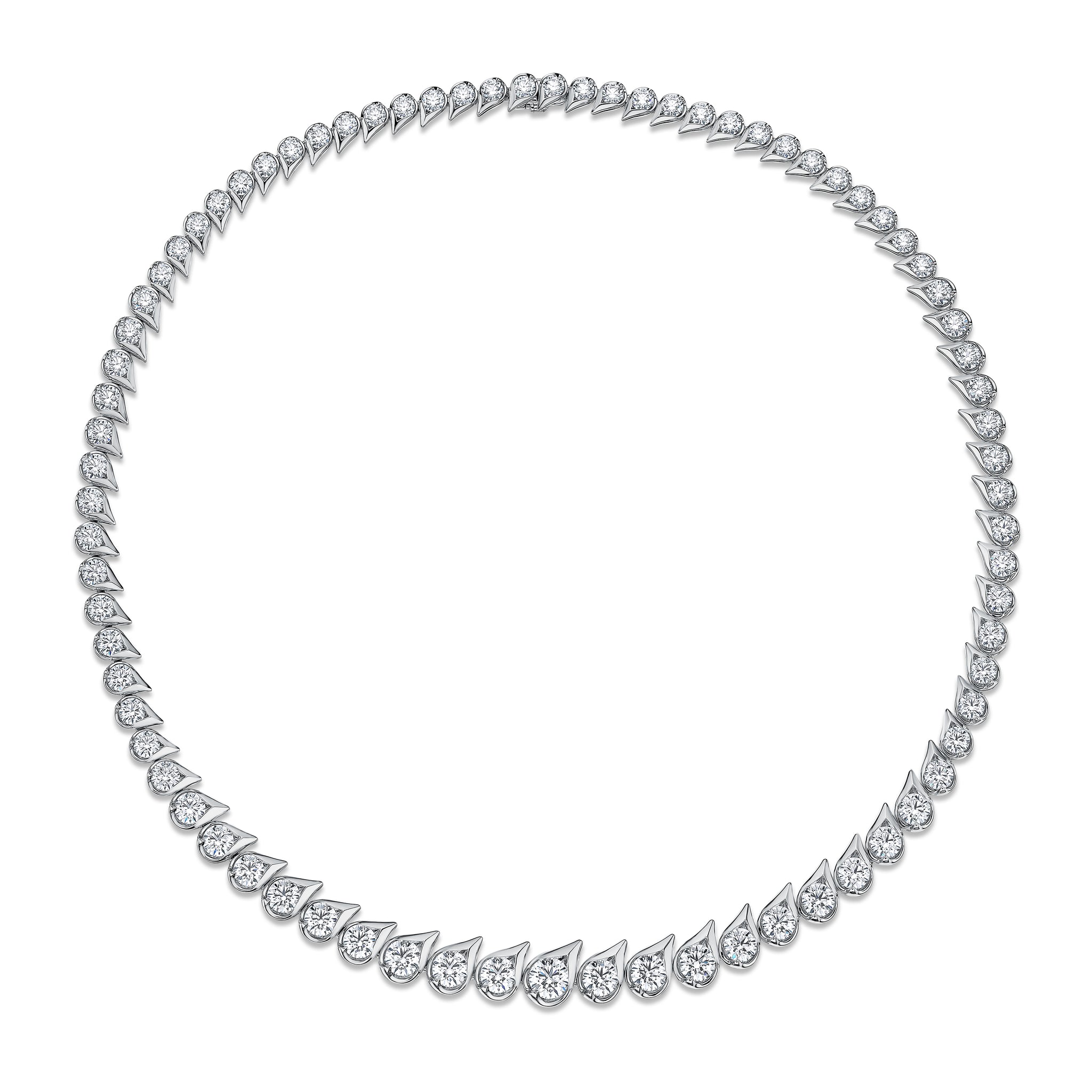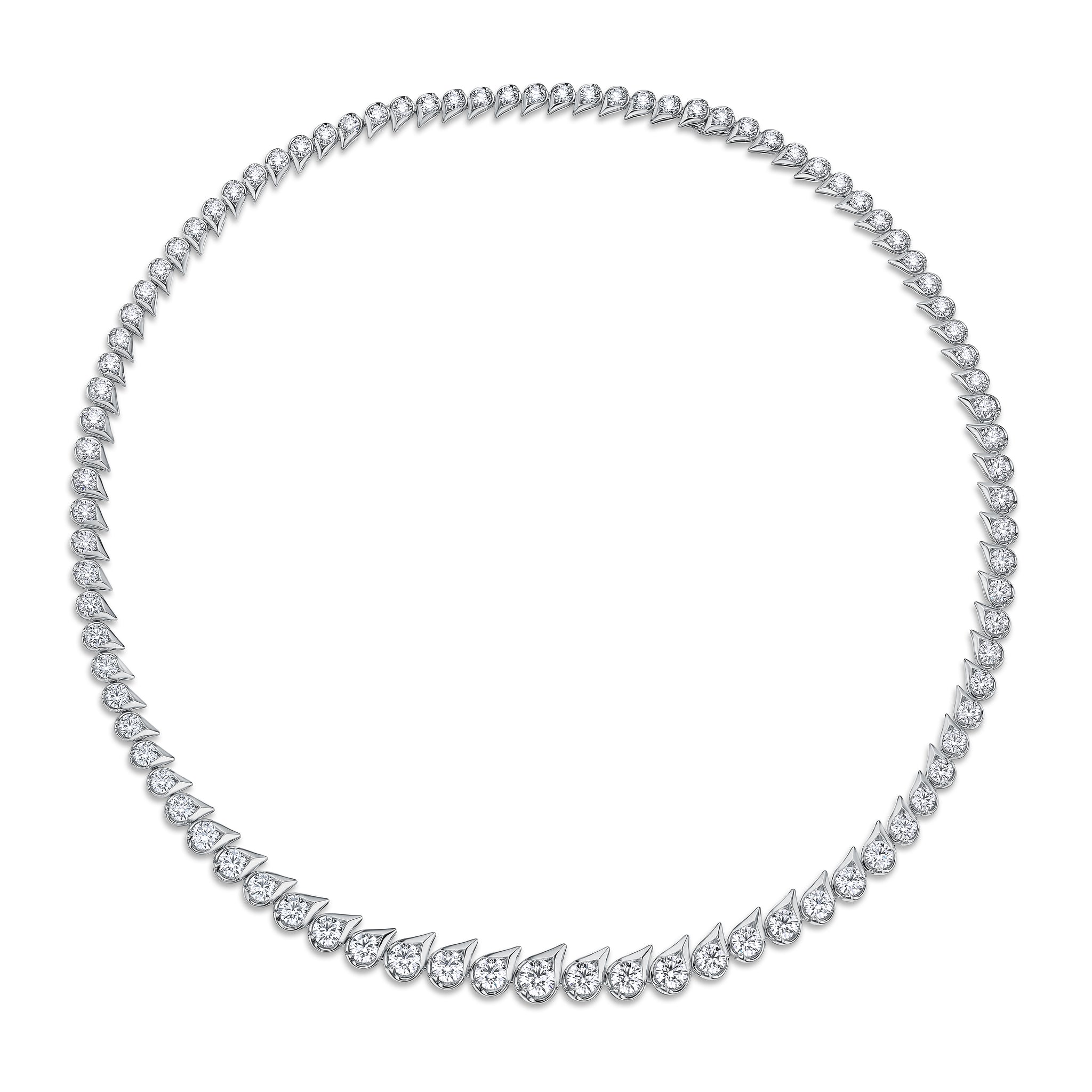 The LU Droplet Graduated Necklace immediately catches the eye with its trail of dew drop-shaped motifs. Each drop is set with a brilliant diamond in graduating sizes, enveloping the neck in continuous sparkle.